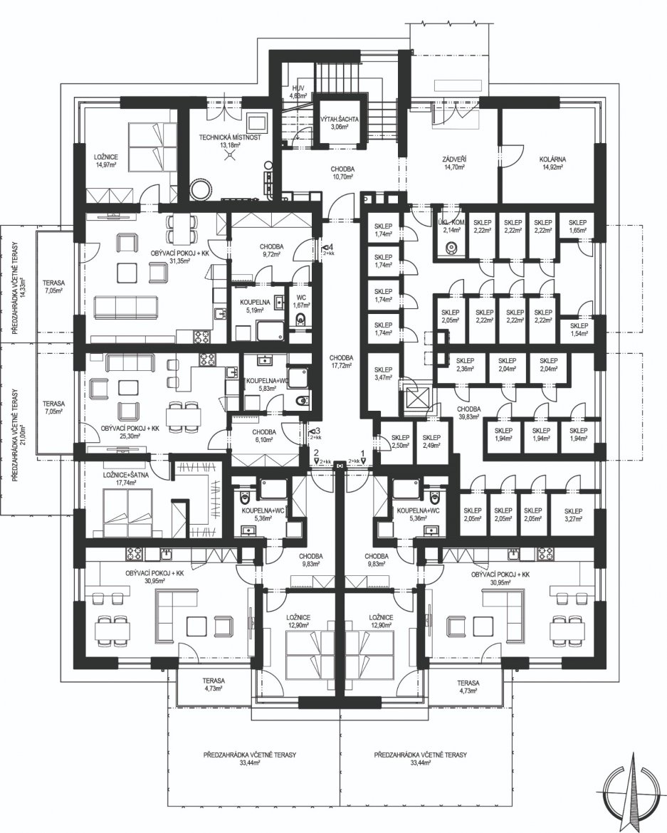 Číslo | Dispozice | Podlaží | Celková plocha | Balkon / Terasa | Sklep | Cena | Stav | |